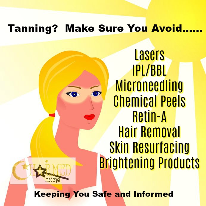- Lasers and laser resurfacing should be avoided if tan. There are a ton of different types of lasers and many are designed to remodel the skin and promote collagen renewal or remove unwanted hair. If you have a tan, the laser should be avoided entirely. You can blister or burn.