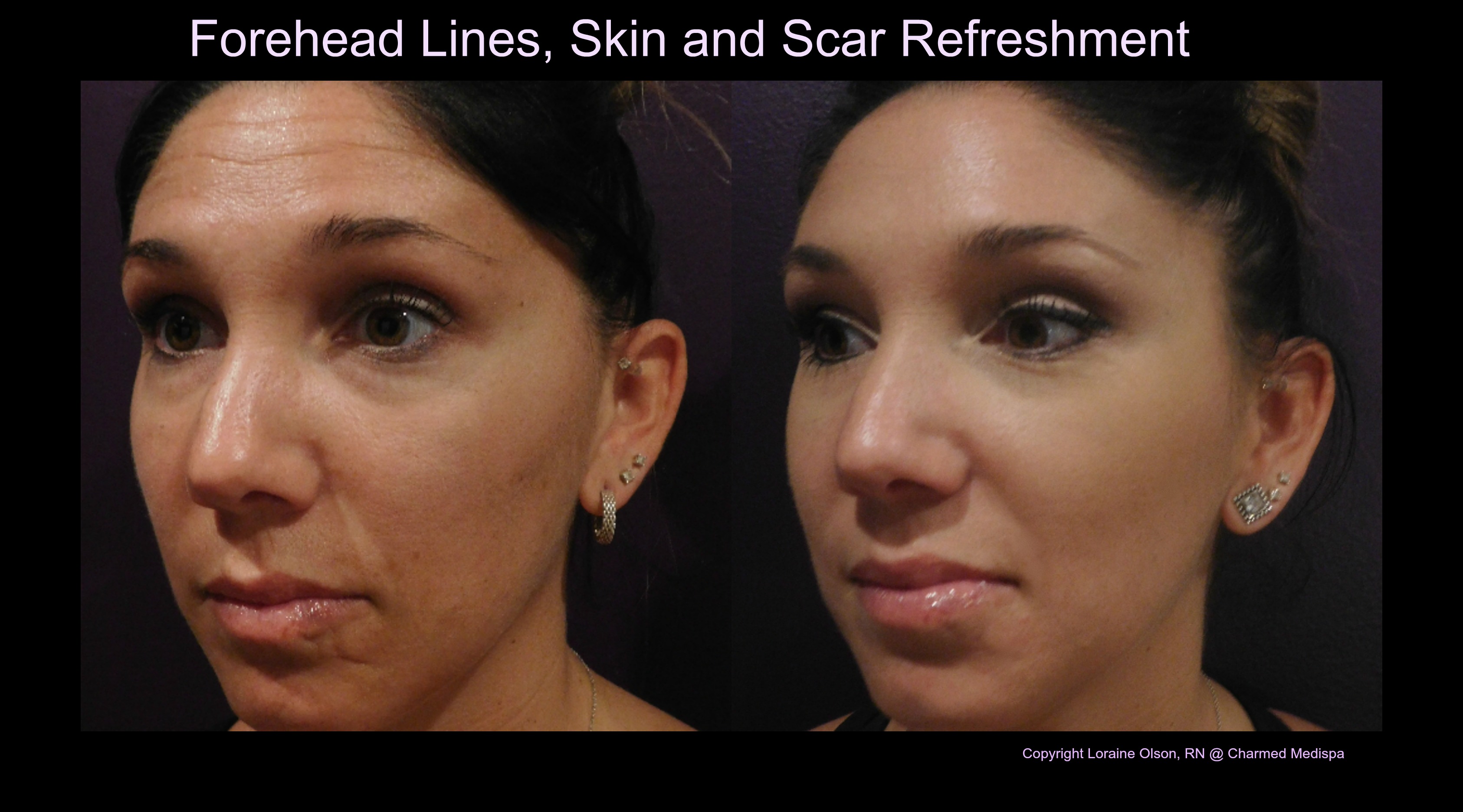 Notice the scar improvement on her lower lip area? Loraine Olson, RN, is very proud that she can forget that she had a scar. The facial scar is vastly improved and more importantly, she is happy (that’s what is key). Scar management is important and there are resources to address scar depressions, scar elevations and mottled scar pigmentation with redness and brown discoloration. Many people think there is nothing they can do for scars but we have a ton of resources to address your concerns.