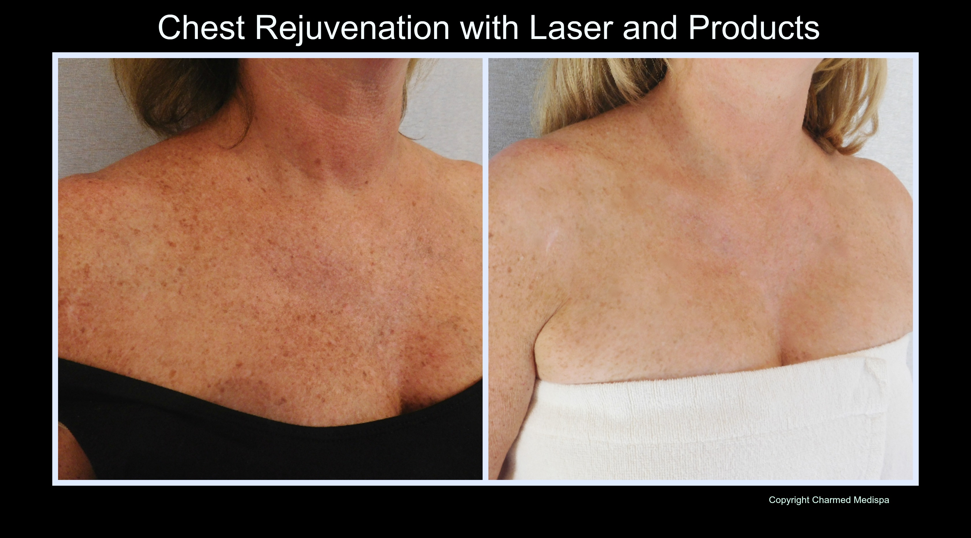 Many people focus on their face for rejuvenation and improvement in lines, pigmentation and wrinkles but forget about the chest area. Next thing you know, the chest looks way different that the face. We encourage you to make sure your appearance is cohesive. Look at your face and exam the contrast (or lack of contrast) from the chest area. The chest area is often exposed to more sun and when you go swimming it loses its sunscreen faster. Reapplication of sunblock is needed more often on the chest area. The chest and decolletage can be improved with practicing better sunblock application (and the right sunblock) as well as products for rejuvenation like Nectifirm from Revision Skin Care and Advanced Neck Firming Cream from Sente as well as RetinA application. After the skin is prepped, we add Intense Pulsed Light and laser resurfacing to get rid of skin textured lesions. The results of chest rejuvenation can be long lasting and are highly satisfying. Then you can wear your scoop neck dresses and shirts with confidence! Looking good and feeling great! We offer complimentary consults about skin concerns including melasma, acne, photodamage, wrinkles and fine lines, pore reduction, hair removal, folds and depressions and much more. We are Delaware’s experts in the medical spa field with over 30 years of combined experience!