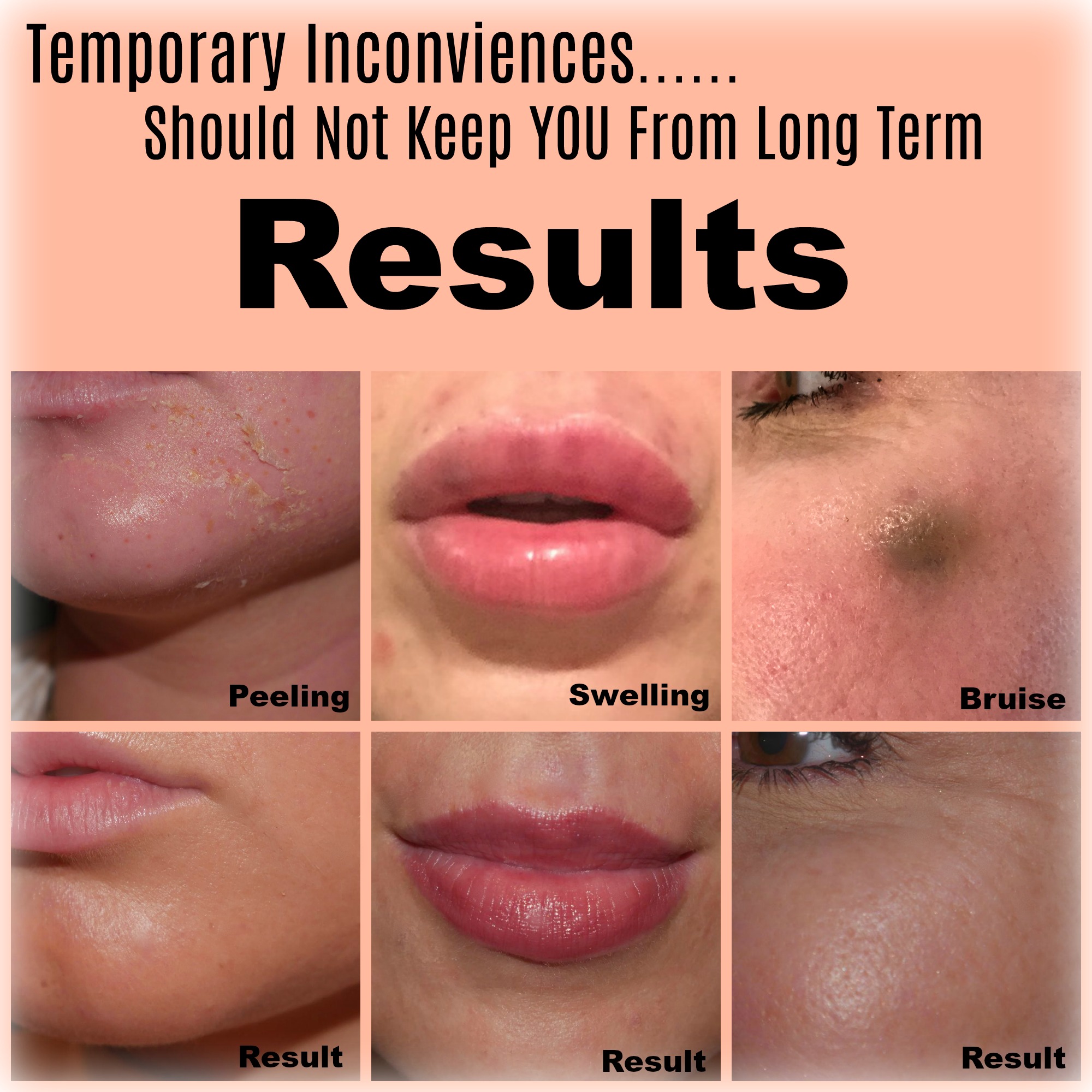 Let me give you a comparison. Many of us want to have the firm and in shape bodies of women we see that work out all the time…..but are we willing to put the work into it that they are? It is often inconvenient and very often it’s uncomfortable to achieve those firm results….but it certainly appears like the outcome is worth it, right?! The change they achieved is real and impressive. It is exactly the same with having really good and healthy skin and even improvement if facial sagging and looseness! Sometimes a little temporary peeling is part of achieving your skin goals! To get more even contours and wipe away lines etched into our face it often may come with some temporary swelling and/or small bruise. All of these things are temporary. The RESULT is what is long term and fabulous.