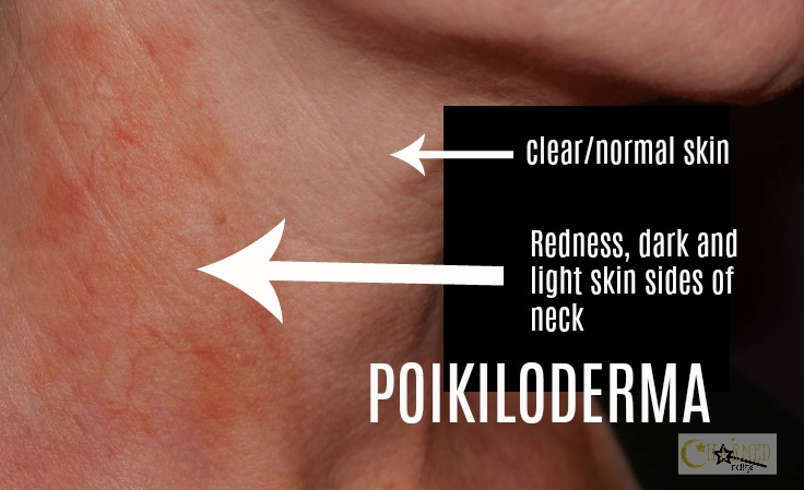 Have you noticed that the sides of your neck are darker than the area in your neck directly under your chin? The darker skin can also have redness and white patches? Have you noticed that it gets worse in the summer? This condition is often poikiloderma. Poikiloderma is a complex skin condition that has sun damage, white patches (hypopigmentation) and broken capillaries with redness.