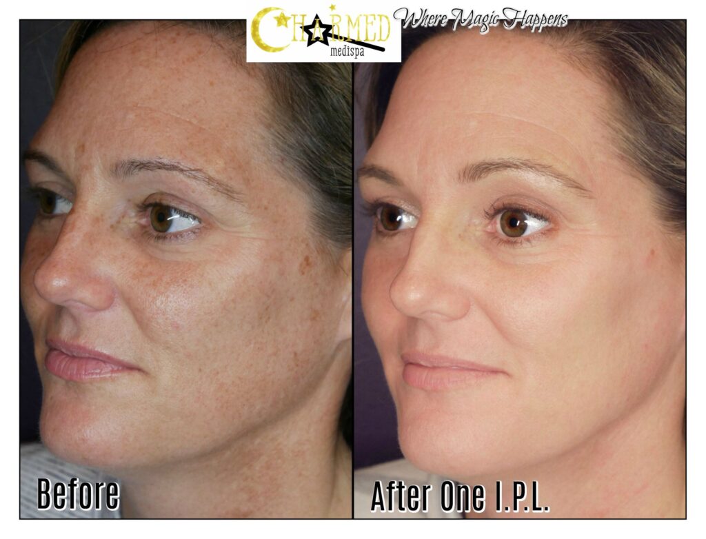 IPL has been around for about 2 decades and IPL treatments has been tried and true since it was invented. A light source targets freckles and sun spots without damaging the skin or causing peeling. The sun spots will get darker and then come to the surface of the skin and fall off in about 7-14 days. Look at the dramatic transformation our patient went through after IPL of the face. In addition to treatment on the face, IPL can be performed on the neck, chest and even body. Our patients love IPL. “I’m more sensitive to products and I wanted a solution that can improve my skin without irritation. I’m fascinated by my results with IPL. I didn’t have downtime and my skin looked so much better.” That’s a typical reaction to treatment with IPL performed at Charmed Medispa.