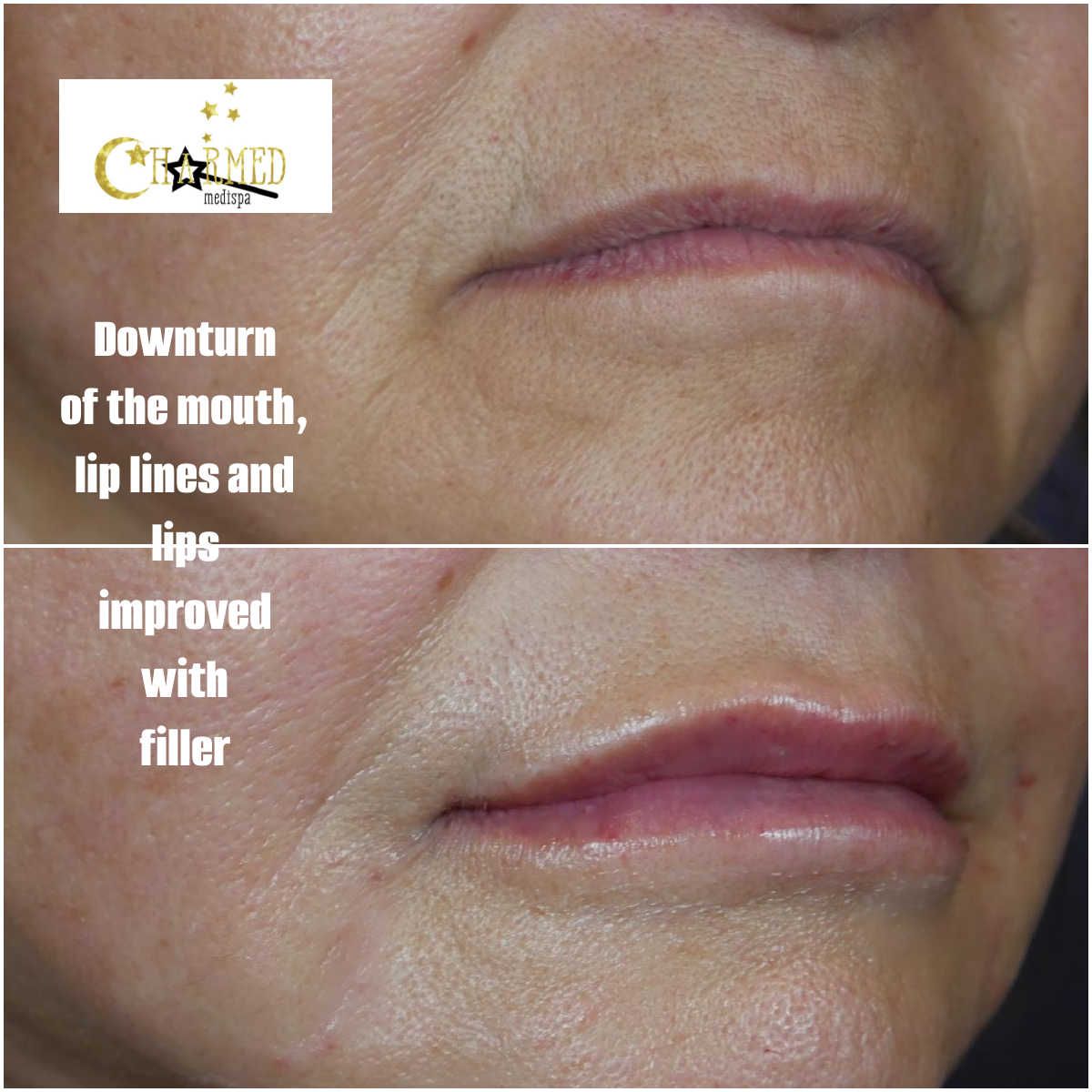 Look at this beautiful before and after of our patient where the corners of the mouth are lifted, the lips are softened and lip lines are improved. She is thrilled and happy with her care at Charmed Medispa. That is our goal with every patient.