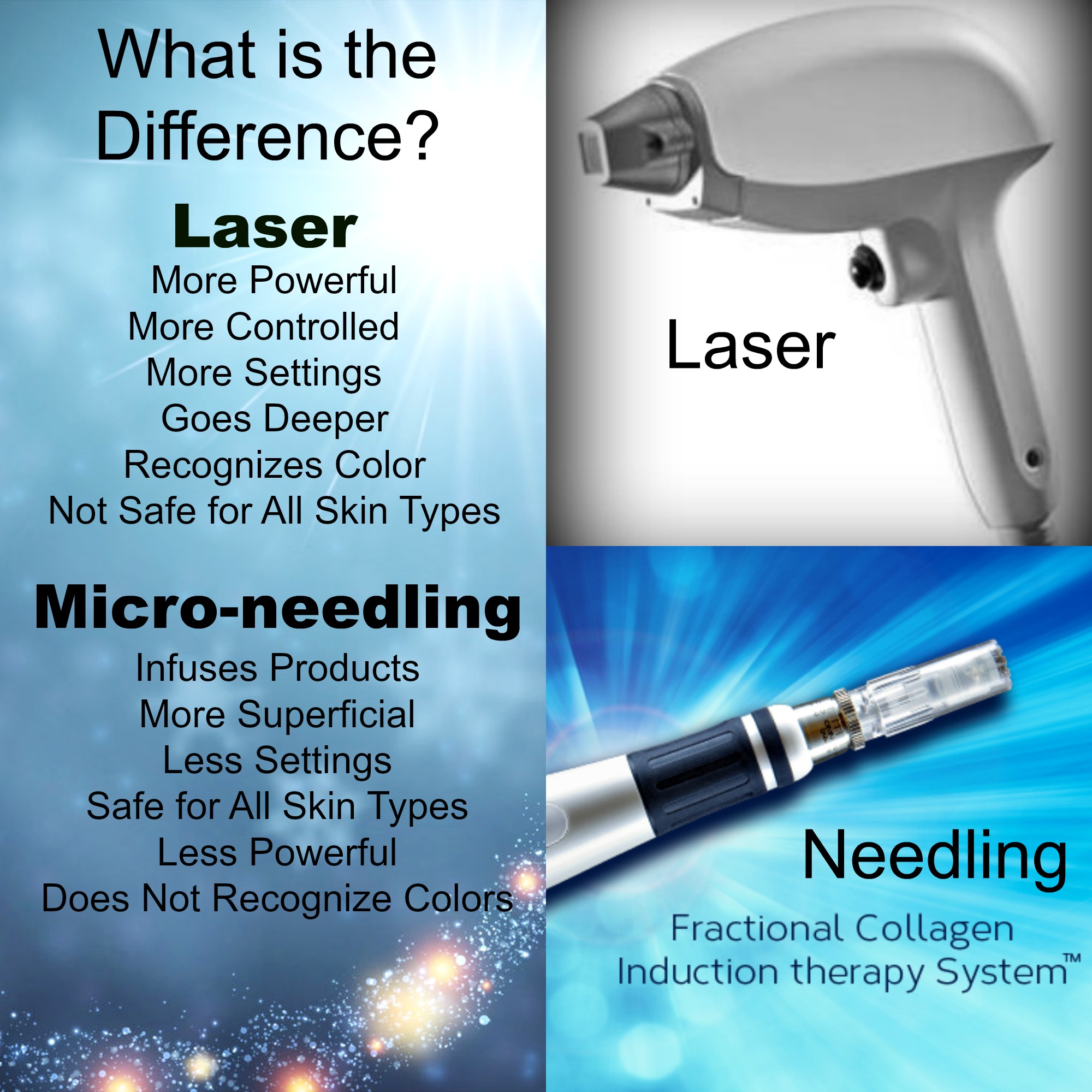 In addition, a laser cannot be used on tan skin and some darker skin clients. But a microneedling, can be used on all skin types. A laser can remove brown spots very, very fast but a microneedling device does not have the same wow results for spots.