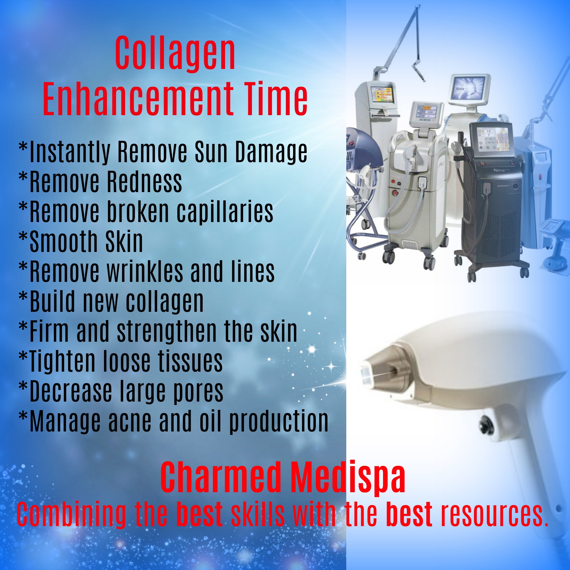 There are very good resources that can rebuild your collagen and we are obsessed with them. The first resource is excellent, medical grade skin care with ZO Skin Health which is top of the line, scientifically proven skin care with exceptional protocols to elicit collagen renewal. From Retinal Skin Brightener, Retina, Wrinkle and Texture Repair, Firming Serum and more, ZO has it all! Our patients feel transformed using this program and our practice customizes each and every patient on their own formula of products and how to use them. Charmed Medispa is proud to be in the top 1% of ZO Skin Health providers and our entire staff have ZO certifications.