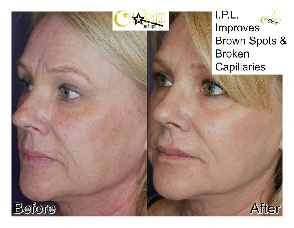 At Charmed Medispa, the most common treatment for rosecea and broken capillaries is Intense Pulsed Light (IPL). IPL is a light treatment that recognizes and treats broken capillaries, redness and sun spots. IPL of the face is one of the most commonly performed treatments at Charmed. IPL will feel like a rubber band snap meanwhile cold air is used at the same time making you comfortable. The broken capillaries will start to shrink and the sun spots will actually look darker when you are done. After a week, the sun spots will literally fall off your skin without any peeling. The capillaries will start to fade. The skin will be less ruddy and blotchy. The golden rule to have IPL is not to have any tan when you come for your appointment. If you are committed to not tanning, IPL can be done in the summer. There is no downtime with IPL but you might have some swelling that can be managed with ice.