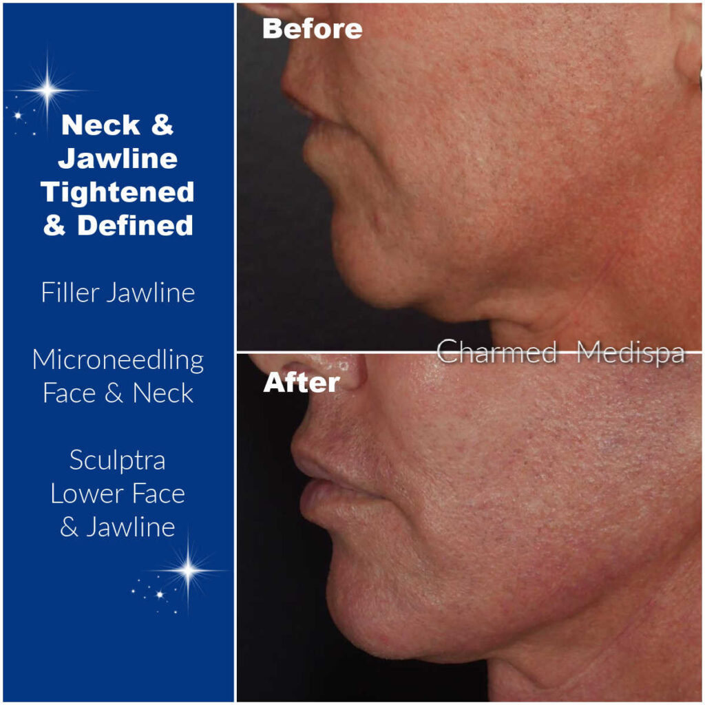 After filler is placed or instead of filler, Sculptra can be used to lift and sculpt the face and define the jawline, lift the jowls and balance the face. Sculptra is a water like substance that has an active ingredient in it to shrink the skin. Sculptra makes skin tighter and firmer and lifted. Sculptra is done in a series of 3 sessions and results can last 2 years. Our patients and providers rave about Sculptra and our practice does a good amount of Sculptra injections for our community.