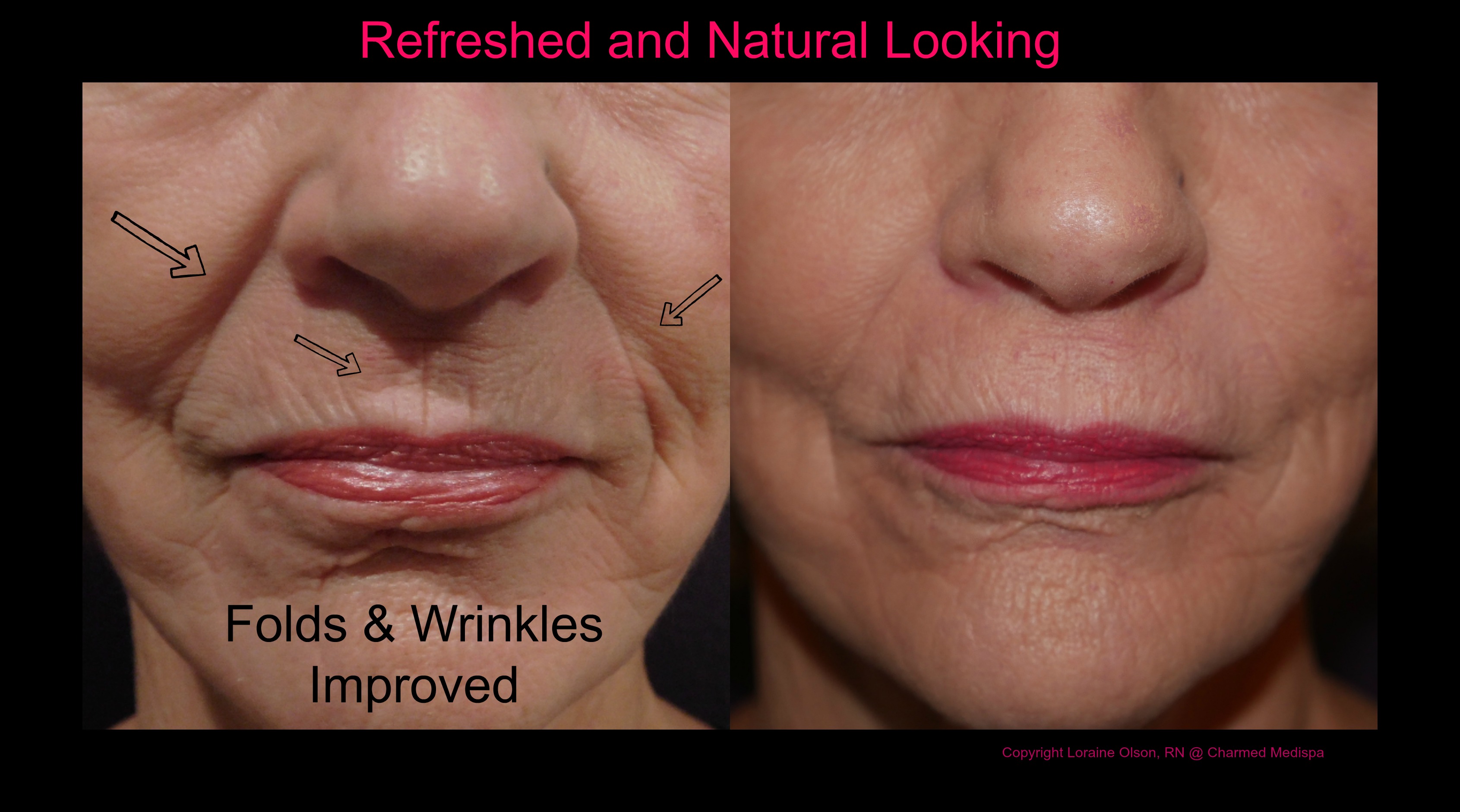 If only we could stop that misconception that filler makes you look filled (this question comes up often!). If only we could all adopt the appropriate thought that filler is like using a little spackle on the face. You know you have home repairs and spackle works like magic on your walls. Well, it works double magic on the face. We need a HGTV for the face channel! Dermal filler fills in folds and lines and makes you look more seamless. Filler makes you look refreshed and keeps your facial features balanced. That’s it. Yes, there are people walking around looking “filled” but did you ever consider that they might LIKE looking like that. That is their desired outcome. But, that is not the general request and certainly not the outcome. Also, it takes A LOT of filler to look filled. Here, in this before and after result, is an excellent example of softening of lines and folds that was accomplished with dermal filler and our customized medical grade skin care. She looks like herself and is thrilled that she has accomplished refreshment. There’s nothing unnatural about her results. You cannot see filler. In addition, she has collagen rebuild and her skin is healthier. Repeat after me, filler looks natural, filler looks natural, filler looks natural. Do not spend so much mental energy on thinking otherwise. If you want to look more refreshed and seamless, filler in a safe, excellent option and medical-grade, managed skin care is a game changer. We are proud of offer education and results that are what you should expect from experts. In addition, we offer laser services like laser hair removal, Intense Pulsed Light (IPL), laser resurfacing like Pixel and Fraxel as well as Botox, chemical peels and relaxation services like facials. We are located in Newark, Delaware, and serve the tri-state area. Make Charmed Medispa your rejuvenation destination!