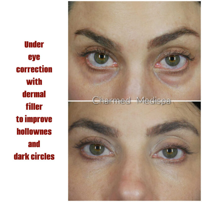 Do you feel like your under eye area is hollow and dark? Do you look tired? At Charmed Medispa, we have resources that can help improve under eye darkness with hollowness with dramatic yet natural looking results. Look at this beautiful before and after result of using dermal filler to lift and contour the under…