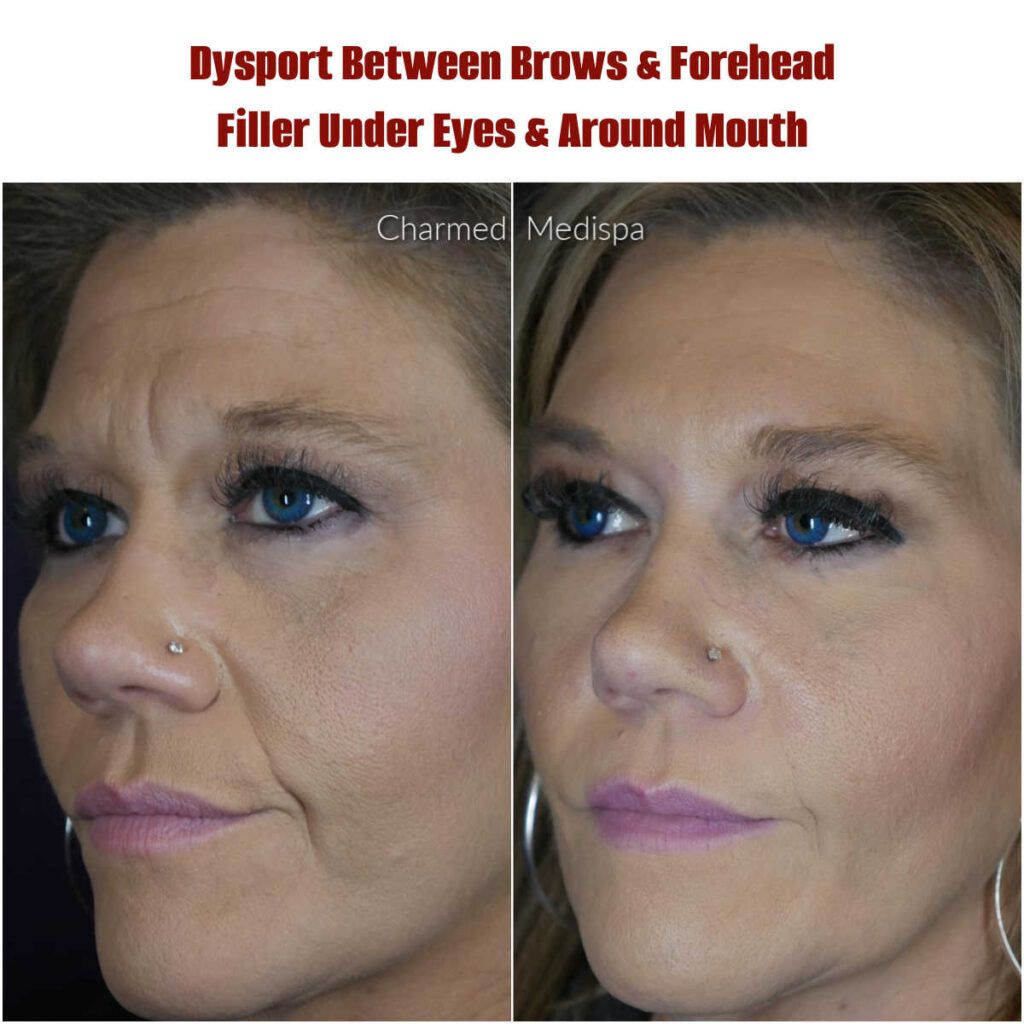 Check out the results of our patient after having Dysport between the brows and forehead, filler to the under eye area for rejuvenation as well as filler in the folds around the mouth to lift and smooth her skin. This result is outstanding and she is thrilled. “This is a typical result at Charmed Medispa when the patient is committed to doing what is best for overall rejuvenation with natural looking results,” states Loraine, our nurse injector with 20 years of experience.