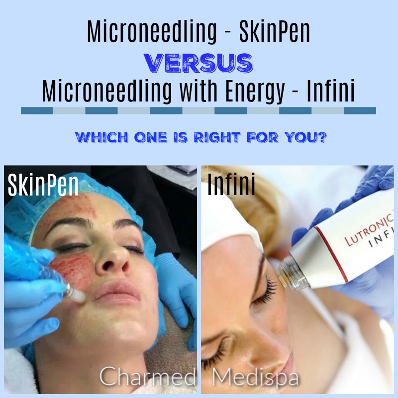 - Microneedling with energy called Infini is a very different option than traditional microneedling with the SkinPen. This type of skin rejuvenation treatment uses microneedles to infuse radiofrequency energy in the skin. This type of energy is well known to tighten and firm the skin more significantly than traditional microneedling can. Infini can be a better option for deeper lines, sagging and acne scarring. The needles penetrate the skin deeper as well. Just like the SkinPen, you will have pink to red skin and you can put makeup the next day. You will also be numbed during treatment however, you can feel the treatment more intensely than the SkinPen. Our med spa uses a cooling device during treatment. Infini requires 3-4 treatments depending on your desired outcome and skin condition. Cost is $495 on up depending on the treatment area.